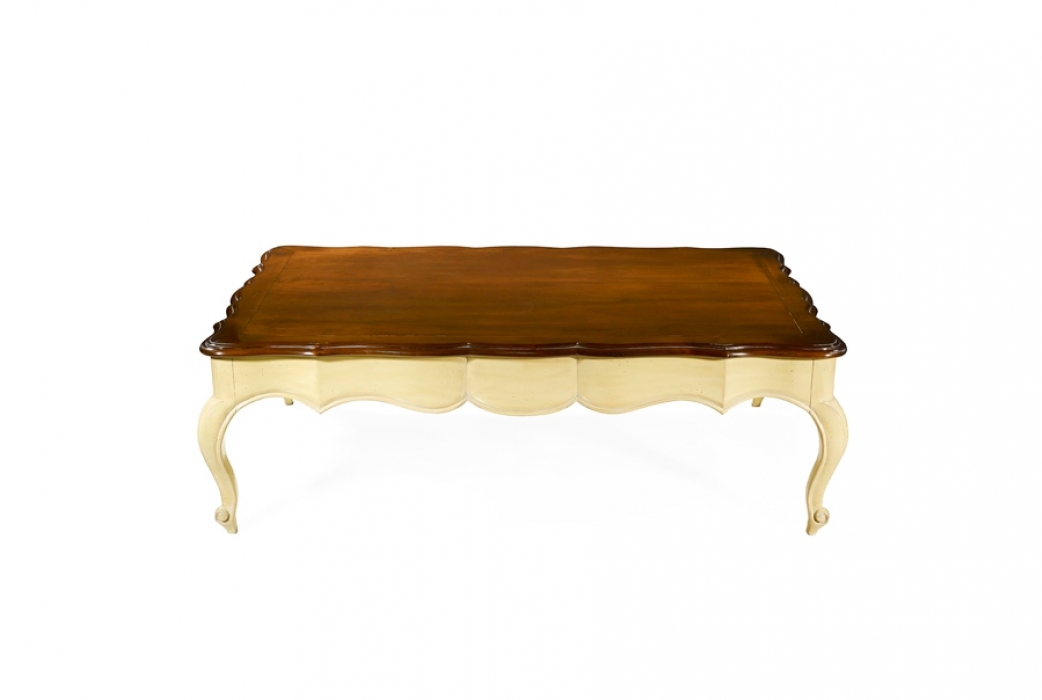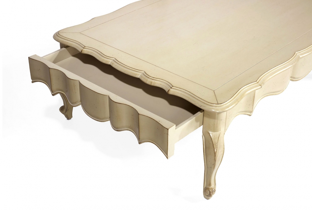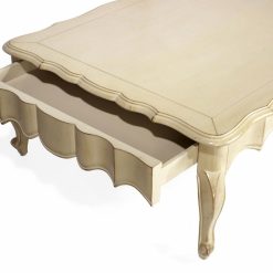 Bàn cà phê Alison được làm bằng gỗ Anh đào với lớp hoàn thiện màu Xám nhạt. Lưu ý phần chân cong và chi tiết chạm khắc thủ công tuyệt vời của chân váy.